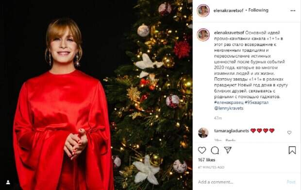 Именно в таком виде она снялась в промо-ролике вместе с коллегами из студии "Квартал 95". Знаменитость позировала на темном фоне возле красиво наряженной елки. Елена сложила ладони вместе, излучая добродушную улыбку. "Основной идеей промо-кампании канала «1+1» в этот раз стало возвращение к неизменным традициям и переосмысление истинных ценностей после бурных событий 2020 года, которые во многом изменили людей и их жизни. Поэтому звезды «1+1» в роликах празднуют Новый год дома в кругу близких друзей, связываясь с родными с помощью гаджетов", - отмечается на фанатской странице юмористки. Пользователи социальной сети оценили внешний вид Елены Кравец, в котором она пощеголяла в предновогоднем ролике канала "1+1" и оценили ее блистательный внешний вид: "Ленуся ❤️❤️❤️. А идея ролика, очень верная