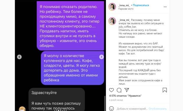 Порадовать. Она ест, пьет водичку за столиком на улице, а потом забегает и говорит (в 3 годика): "Пустите, пожалуйста в туалет", на что бариста отвечает: "Нельзя. Только для персонала", - рассказала Мирошниченко. Мама была вынуждена подхватить ребенка на руки и срочно бежать с ней домой. Она возмущена таким отношением, так как является постоянной клиенткой этого кафе. Инна Мирошниченко написала хозяйке заведения, но вместо извинений получила странные объяснения о том, почему нельзя было пустить ребенка в туалет. В частности, хозяйка заведения предложила ей в подобных ситуациях обращаться к консьержам в подъездах. Переписка с владелицей кафе закончилась тем, что Инну Мирошниченко заблокировали на всех страницах заведения. Стоит отметить, что по распоряжению КМДА №578, в столице с 2008 года было введено бесплатное и свободное пользование жителями и гостями города туалетами в кафе и ресторанах. Все владельцы заведения были предупреждены о таких требованиях. Напомним, под Львовом директор затравила учениц и понесла наказание за это. Как сообщала Politeka, украинская учительница на Полтавщине довела ребенка до крайности, а наказали за все это мать школьника. Также Politeka писала, что горе-педагог решила наказать ребенка из-за отсутствия ручки и угрожала отрезать школьнику палец.