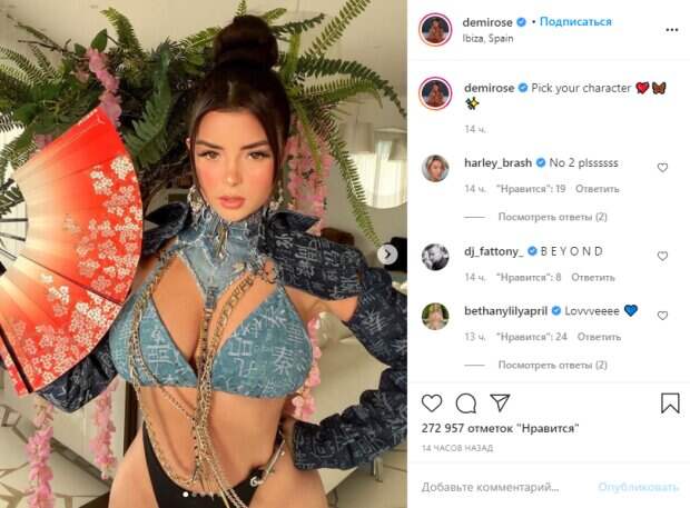 Девушка дополнила изысканный образ японской гейши красным веером. На плечи модель натянула необычный экстракороткий топ с длинным рукавом. "Выберите свой персонаж 💘🦋✨", - подписала Деми кадры. Пользователи кинулись обсуждать увиденное и выбирать лучшие снимки: "Такая милая💖" "Ты такая ошеломительная! 🖤" "Красивая женщина, вы смотритесь отлично на всех фотографиях❤️" "Выглядит великолепно @demirose, не многие смогли бы это осуществить, но боже мой" "Богиня 💎" "Вау, просто вау 🥺🥺🥺😍🔥" "настоящая гейша" Ранее мы сообщали, Деми взбудоражила сеть пленительным фото, ради которого полностью избавилась от стыда и одежды. Красотка позировала на закате, сидя на бортике бассейна спиной к объективу. Пикантной деталью стали белые полосочки на ее загорелом теле. Также мы рассказывали, Деми восхитила пышными формами в черном монокини на завязочках. Красотка позировала на фоне воды, соблазнительно выгнув спину и подняв руки вверх. Стоит отметить, полы купальника, видимо, с трудом сошлись на ее аппетитном бюсте - завязочки так и норовили "треснуть". "О Боже! Что за богиня? 😍😍😍", "Так горячо", "Супер милая"; "Идеальная крошка"; "Ты выглядишь потрясающе"; "Самая горячая вещь, которую я когда-либо видел ❤️🔥🙌"; "Ух ты, детка, ты слишком чувственная и провокационная. Люблю тебя 👏🍆👅", - отреагировали поклонники. Напомним, разгоряченная Деми Роуз подразнила видом в распахнутом халате: "Где твой лифчик?" А еще Politeka писала, что сочная Деми Роуз в «невидимом» белье посветила упругим орешком: «Держите челюсть!» Также Politeka сообщала, что эффектная Деми Роуз в нескромном наряде оседлала быка: устоять невозможно