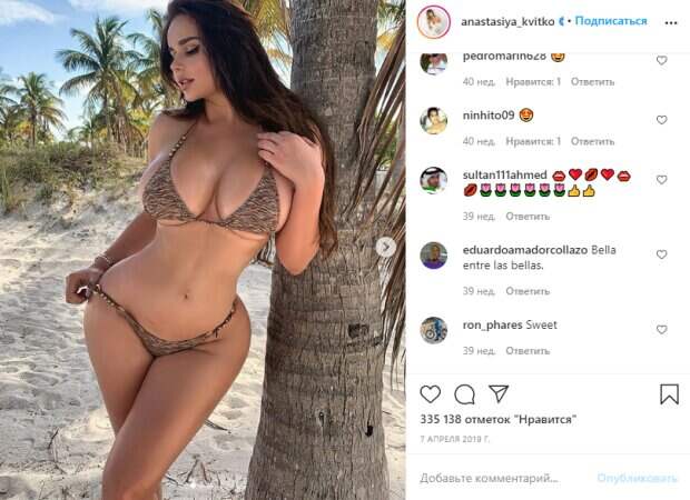 Знаменитая российская модель Анастасия Квитко, более известная как русская Кардашьян, похвасталась на пляже модным купальником Девушка не любит говорить о похудении, более того, модель с пышными формами и тонкой талией всячески избегает вопросов о целлюлите и фотошопе своих фото. При этом красотка не боится показывать себя на пляже в слишком смелых бикини.