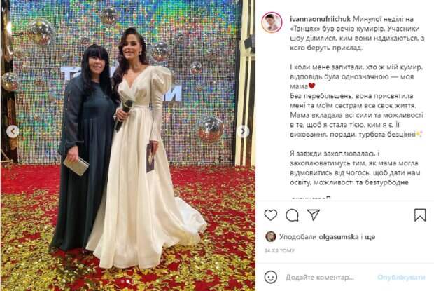 Судя по снимкам, женщина не пропускает ни один эфир дочери. На фотографиях Иванна позирует в разных образах, в которых появлялась в разных эфирах шоу, а рядом с ней стоит мама, которая также в разных нарядах. В подписи к фотографиям Онуфрийчук рассказала, что ее главный кумир в жизни – это мама. И надо сказать, что женщина выглядит просто потрясающе. "Когда меня спросили, кто же мой кумир, ответ был однозначным – моя мама. Без преувеличений, она посвятила мне и моим сестрам всю свою жизнь. Мама вкладывала все силы и возможности в том, чтобы я стала той, кем я есть. Ее воспитание, советы, забота бесценные", - написала Иванна. Напомним, Ведущая Иванна Онуфрийчук из "Танців з зірками" повилась без макияжа перед съемками и удивила внешним видом: "Сегодня...". Как сообщала Politeka, красотка Иванна Онуфрийчук из "Танців з зірками" похвасталась романтичным сюрпризом от любимого мужа: "Именно так и должно быть". Также Politeka писала, что ведущая Иванна Онуфрийчук из "Танців з зірками" в образе Белоснежки раскрыла свой секрет про хореографа Влада Яму: "Как восхищалась".
