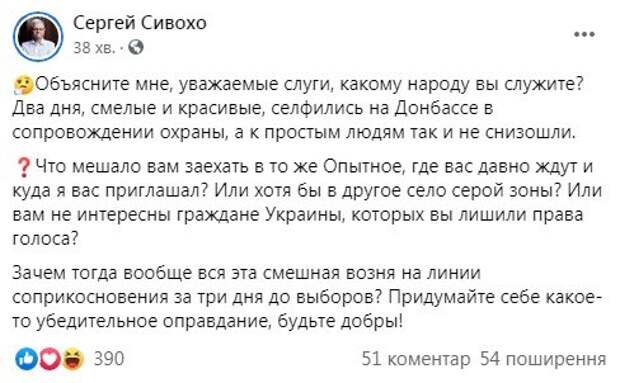 "Объясните мне, уважаемые слуги, какому народу вы служите? Два дня, смелые и красивые, селфились на Донбассе в сопровождении охраны, а к простым людям так и не взошли", - возмутился Сивохо. Он спросил у "слуг", что им мешало заехать в то же Опытное, где их "давно ждут", и куда сам Сивохо их раньше приглашал. "Или хотя бы в другое село серой зоны? Или вам не интересны граждане Украины, которых вы лишили права голоса? Зачем тогда вообще вся эта смешная возня на линии соприкосновения за три дня до выборов? Придумайте себе какое-нибудь убедительное оправдание, будьте добры", - обратился Сивохо к нардепам. Как известно, несколько недель назад Сивохо посетил населенный пункт Опытное и пригласил нардепов приехать и попробовать пожить там. "Приезжайте сюда - здесь много разрушенных домов. Можно будет провести ночь, как вы и хотели. Посидите в темноте, может на вас и снизойдет озарение. Все подопытные украинцы ждут вас, ведь они за вас голосовали. Ну, когда им это было позволено", - обратился тогда Сивохо к народным избранникам. Напомним о всеукраинском опросе Зеленского, президент раскрыл, что будет на выборах: "нужно ли ввести...". Как сообщала Politeka, Арахамия раскрыл важный нюанс о всеукраинском опросе Зеленского: "почему сейчас? Потому что...". Также Politeka писала о опрос Зеленского 25 октября, кто и как его будет проводить, важные правила.