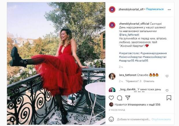 Известная украинская актриса Лера Товстолес, звезда "Женского квартала", показалась в горячем образе Как пишет Politeka.net, Лера сегодня празднует 26-летие. Молодая красотка чаще всего играет роли любовниц, моделей и полицейских, а в будущем бы хотела сыграть роль в полнометражном фильме. На фото, которое появилось на страничке "Женского квартала", Лера позировала в колготах, ботинках и красном прозрачном платье.