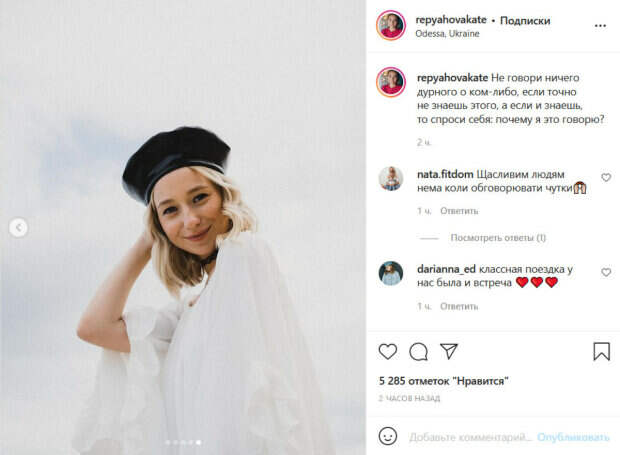 Накануне она пожаловалась на то, что для малыша путешествие оказалось тяжелым: поначалу он много плакал и практически не спал. Из-за капризов ребенка Екатерина была на грани срыва. Спустя несколько дней нахождения на курорте Миша немного успокоился, позволив родителям расслабиться. Тем временем Репяхова оказалась недовольна тем, как СМИ представили эту историю. В ее новом посте также есть намек на осуждение со стороны незнакомых людей. «Не говори ничего дурного о ком-либо, если точно не знаешь этого, а если и знаешь, то спроси себя: почему я это говорю?», - написала Екатерина. Она также поделилась своими фото, сделанными на пляже в Одессе. На снимках Репяхова позировала в белом платье и берете. Напомним, молодая жена Виктора Павлика за границей пожаловалась украинцам на трудности. Как сообщала Politeka, Виктор Павлик показал, как проводит время с маленьким сыном за границей. Также Politeka писала, что жене Виктора Павлика стало плохо на отдыхе в Турции, откровения пугают.