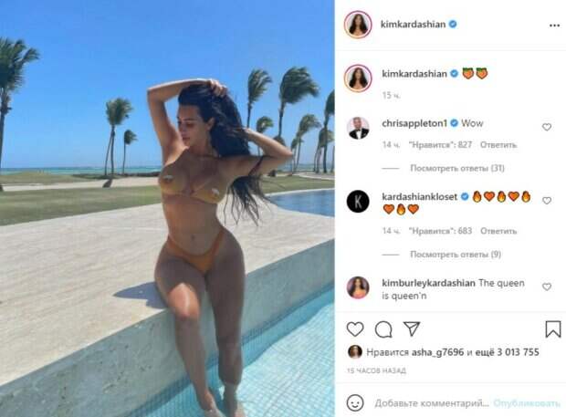 Фишкой образов Ким является ее любовь к пляжным лукам, поэтому звезда чувствует себя непринужденно, когда позирует в купальниках и выставляет фигуру на всеобщее обозрение. При этом Кардашьян старается как можно больше прогнуться перед камерой, хвастаясь необычно тонкой талией и пышными бедрами. Фанатам приходятся по душе именно пляжные образы Ким, и это раз не был исключением: «Ух ты; Королева королева; такая прекрасная девушка; Ким уже обновилась к лету; легендарная красавица; звезду выбросило на берег; не прекращайте быть такой роскошной; Закреплено; Великолепно