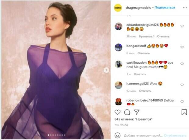 Так, молодая и прекрасная Анджелина Джоли в 1991 году приняла участие в провокативной фотосессии в одном темно-фиолетовом боди с сеточкой. Аккуратная прическа, минимум макияжа и простая поза превратили простой наряд в полноценный и игривый образ. Как видно, Анджелина привлекает внимание общественности не только благодаря своей общепризнанной красоте и великолепному вкусу в одежде, ей удается с легкостью позировать перед камерами с самого начала карьеры. Уверенность стала также ключевой в новом фото Джоли, которая отвернула лицо от камеры, покоряя идеальным профилем. Не так давно также в сети показали очередное преображение Джоли. Как видно на снимке, представленном на фан-аккаунте в Инстаграм, стройная Джоли выглядит очень красиво в простом платье из шелка. Нежно-розовый оттенок подчеркнул светлую кожу звезда, а отсутствие деталей сделало образ более интригующим: «Какая дорогая женщина; наша леди на миллион; Привет, красотка; Сексуальная женщина