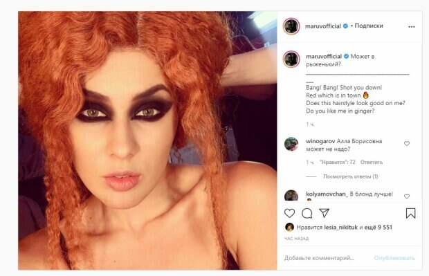 Известная украинская певица Анна Корсун (MARUV) показала себя в неординарном образе Красотка показала себя в этот раз в какой-то тоненькой одежде, которую невозможно разглядеть. Образ Корсун дополнила ярким макияжем, особенно выделила глаза и брови. Но это не самое интересное, так как у Анны была странная прическа: она покрасилась в рыжий цвет и сразу напомнила Аллу Борисовну Пугачеву.