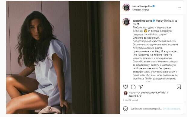 Сейчас красотка активно ведет социальные сети, где регулярно публикует интересный контент. На новом фото, которое Санта опубликовала в Инстаграм, девушкка позировала в одной блузе, не надев даже штаны. Красотка сидела, выставив ножки вперед, а волосы оставила распущенными. "Happy Birthday to me. Люблю этот день и жду его как ребёнок. И всегда, в первую очередь, за всё благодарю! Спасибо за красивый, плодотворный, счастливый год. Он был очень эмоциональным, полным переосмысления, роста, преодоления и побед. И я чувствую, что нахожусь на пороге чего-то нового, важного и прекрасного. Спасибо всем моим близким людям за поддержку, заботу и настоящую любовь ко мне – это бесценно, спасибо моим учителям за знания и опыт, спасибо вам, мои подписчики, моя Insta family, за ваше внимание, поддержку! Очень ценю и постараюсь не входить в себя надолго и быть полезной и интересной для вас", - написала Димопулос. Фанаты поставили почти 10 тысяч лайков и написали комментарии: "С Днем рождения", "Сантуля, С Днём Рождения, милая! Ты прекрасный, добрый, солнечный и красивый человек!!! Будь счастлива и живи в радости!", "Невероятная, роскошная красавица, с днём рождения! Будь здорова и радостна". Напомним, Димопулос в нескромной позе понежилась на солнышке А еще Politeka сообщала, что победительница «Танців з зірками» Димопулос умостилась в необычной позе на ступеньках Также Politeka писала, что Димопулос показала мужа-бизнесмена, который старше ее на 18 лет