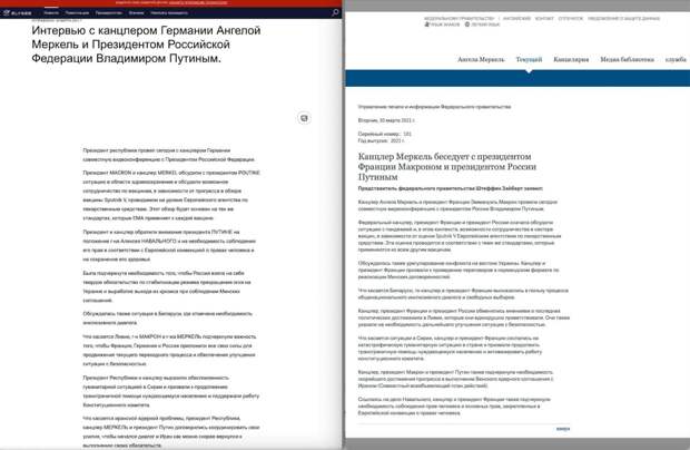 Германия и Франция дали комментарии по вчерашним трехсторонним переговорам Ангелы Меркель, Эммануэля Макрона и Владимира Путина, которые обсуждали, в том числе, и вопрос эскалации на Донбассе. Klymenko Time опубликовал два релиза в среду, 31 марта. У Меркель заявили, что вместе с президентом Макроном она призвала к проведению переговоров в "Нормандском формате" с целью реализации Минских соглашений.