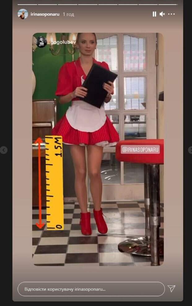 Известная актриса Ирина Сопонару, звезда "Квартал 95", показала себя в необычном образе На фото красотка позирует в красном мини-платье с белым фартуком. Девушка стоит на каблуках, а в руках держит папку. Волосы Ирина собрала в хвостик, а образ дополнила ярким маникюром. Сопонару не стеснялась показать себя, а особенно - длинные ножки, которые как подмечено на фото, составили полтора метра.