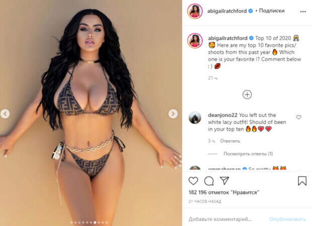 Американская модель Эбигейл Рэтчфорд похвалилась роскошными формами в новом купальнике В этом году Эби решила подвести итог на своей странице в социальной сети Инстаграм и поделилась топом самых лучших своих фото с необычными образами. Один из кадров понравился фанатам больше всего. Как и ожидалось, наиболее привлекательным снимком, по мнению поклонников, был тот, на котором модель позировала в простом бикини на тонких завязках.
