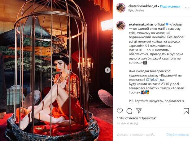 На ней роскошное красное платье в китайском стиле, подходящие под него золотые украшения, а также вычурная прическа, которая идеально дополняет ее образ. Кухар рассказала, что именно так будет выглядеть ее героиня в художественном фильме «Віддана», премьера которого состоится уже 24 августа. На снимках звезда позирует в золотой клетке, сидя в наряде с глубоким вырезом на юбке. Это позволяет ей продемонстрировать свои идеальные ноги. На других фото Кухар позирует в объятиях своего партнера по съемкам. Подписчики активно комментируют снимки. В комментариях также отметились Леся Никитюк и новая звезда «Танцев» Санта Димопулос. «Красиво Мадам Баттерфляй», «Катяяяяяя, это невероятно», «Как всегда вы непревзойденная», «Это неимоверно красиво», «Птичка в клетке», «какие же красивые фото. Катерина вы прекрасны», - пишут люди. Ранее мы писали, что Кухар порезвилась у себя во дворе в весьма откровенном образе. Она нарядилась в миниатюрный купальник черного цвета и забралась верхом на метлу. Волосы красотка собрала на затылке. Екатерина Кухар показала несколько пикантных движений, имитируя полет на метле. Так во время взмахов ногой она продемонстрировала свои упругие ягодицы, которые купальник практически не скрывает.