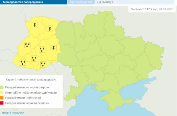Синоптики в Украине 3 июля прогнозируют серьезное ухудшение погодных условий. Очень плохая погода будет в западных, центральных и южных областях. Так, на сайте Укргидрометцентра объявили уровни опасности в этих регионах. На западе Украины ожидаются грозы, а в отдельных районах-град и шквалы 15-20 м/сек.