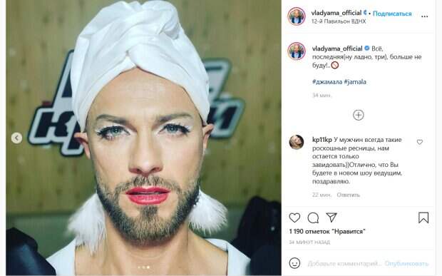 Выступление танцора в платье и на каблуках вызвало настоящий фурор, а сам Яма явно остался доволен своим перевоплощением и уже успел несколько раз поделиться своими фото и видео в образе. На этот раз танцор пообещал, что выставляет фото в этом наряде в последний раз. На снимках крупным планом запечатлен макияж, с которым выступал Яма. Так, его губы накрасили малиновой помадой, а на глазах хореографа красовались белые стрелки и накладные ресницы. Вместе с бородой Ямы такой макияж выглядел очень эффектно. Образ танцора дополнили сережки в виде белых перьев и белый тюрбан на голове. «Всё, последняя (ну ладно, три), больше не буду!», - написал артист. Поклонники Ямы бурно отреагировали на его пост. «Конфетка», «Божественная красавица!», «Кончита Вурст», «Красавэлла!», «Ужас ужасный», «Почти Монро», «У мужчин всегда такие роскошные ресницы, нам остается только завидовать)) Отлично, что Вы будете в новом шоу ведущим, поздравляю», «Атас», «Джамала ещё никогда не выглядела так мужественно, как на этих фото», - пишут люди. Напомним, Влад Яма из "Танців з зірками" на глазах у изумленного сына и жены примерил платье и каблуки. Как сообщала Politeka, Влад Яма в колготках и платье шокировал 5-летнего сына, в сети взбунтовались: «Надоели мужчины в…».