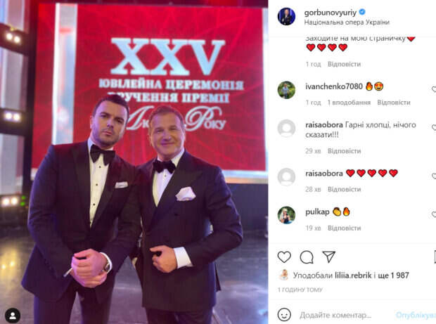 «Наша почетная, ежегодная с Гришей миссия - быть ведущими Общенациональной премии «Человек года»! В этом году юбилейная -25 Поздравляем победителей!», - подписал фото Горбунов. В комментариях 50-летнему Горбунову и 37-летнему Решетнику оставили несколько комплиментов. «Какие красавцы», «Браво», «Отличный тандем», «Хорошие парни, ничего не скажешь», «Вы крутые ведущие», - пишут пользователи сети. Отметим, что Юрий Горбунов является лицом «1+1», а Григорий Решетник работает на «СТБ» и иногда на «Новом канале». Оба телеведущих являются очень востребованными в Украине. Ранее мы писали, что Юрий Горбунов, который вскоре снова станет отцом, показал, как проводит время со своим сыном Иваном. Телеведущий присел за руль, а на колени посадил маленького сына, который пытался рулить автомобилем. Напомним, что Горбунов озадачил семейным фото с Осадчей и сыном, на котором их уже не трое: "А где...". Как сообщала Politeka, Горбунов засветил беременную Осадчую в глубоком декольте, показав, как они проводят вечер пятницы: "Настоящий кавалер". Также Politeka писала, что Горбунов во время отдыха оказался рядом с огромным скорпионом, кадры впечатляют: «Вот это размерчик».