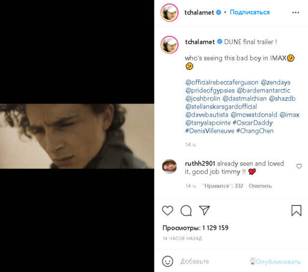 Так, на этот раз актер опубликовал новое видео на своей странице в Инстаграм. На кадрах - финальный трейлер фильма "Дюна" (чтобы посмотреть трейлет, доскрольте до конца страницы). "Финальный трейлер ДЮНЫ! кто видит этого плохого парня в IMAX", - подписал видео Тимоти Шаламе. Фанаты фильма завалили актера приятными комментариями: "Уже видел и полюбил это, хорошая работа, Тимми!", "Не могу ждать!", " видел это дважды! один раз в imax, и это было потрясающе", " Этот финальный трейлер вызвал у меня мурашки по коже !!!! Давай!", "Вы идеальны в этом фильме!". Ранее сообщалось, звезда фильма "Дюна" Тимоти Шаламе свел с ума образами с красных дорожек: "Уже не мальчик" Также, звезды фильма "Дюна" Шаламе и Зендея очаровали видом на красной дорожке: "Нравится, как Тимми смотрит на нее" Politeka рассказывала, Тимоти Шаламе показал, как веселится с коллегой по "Дюне" Джейсоном Момоа: "Наконец-то что-то интересное"