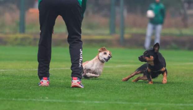 Во время матча 9-го тура чемпионата Болгарии по футболу на газоне улеглась собака и отказалась его покидать. На матче, который состоялся между командами "Пирин" (Благоевград) и "Черно море" (Варна), на 17-й минуте прямо на газоне улеглась собака. Футболист Святослав Дяков попытался отодвинуть животное за боковую линию, но собака упиралась.