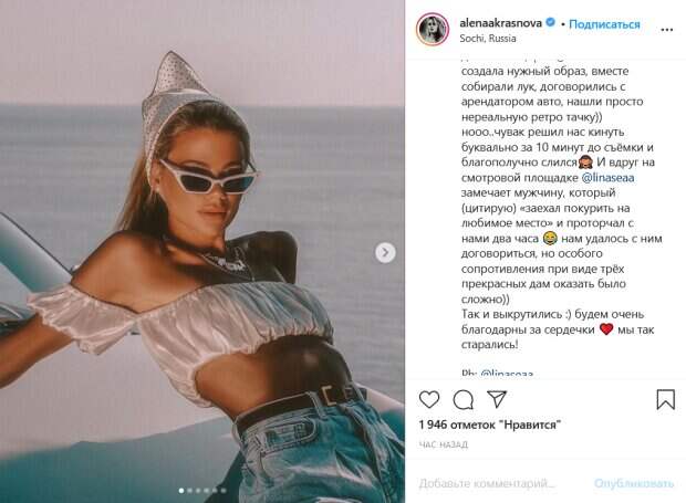 Нужно отметить, что это им явно удалось. На снимках модель позирует в голубых джинсах с завышенной талией и миниатюрном белом топике из сжатой ткани. При этом он оказался настолько тонким, что можно четко различить, что модель не стала надевать под него нижнее белье. Образ Красновой дополнили многочисленные аксессуары, ретро-очки и повязанный на голову белый платок. Модель с уверенностью позирует на фоне моря, всячески выгибаясь и облокотившись на машину. Ее поклонники активно комментируют кадры. «Ну глянец же», «Ну прям очень красивая серия», «Очень красиво», «Ты прекрасна», «Ангел загорелый», «Голивудская звезда», - пишут люди. До этого мы писали, что Краснова и внук Аллы Пугачевой Никита Пресняков продемонстрировали свои настоящие чувства в романтичных образах. Супруги показали себя в образах роковой пары из известного фильма. На черно-белом фото они с мужем запечатлены во время чувственного танца. Пресняков позирует в строгом костюме, а сама модель – черном платье в белый горошек на тонких лямках. Красотка страстно прижалась к своему возлюбленному, не скрывая чувств. В подписи к фото Краснова рассказала, что они с мужем решили примерить на себя образы Мерчелло Рубини и Сильвии из известного фильма La Dolce Vita. Напомним, невестка и внук Пугачевой показали настоящую страсть на камеру. Как сообщала Politeka, в семье Пугачевой ожидается пополнение, Лиза и Гарри будут счастливы. Также Politeka писала, что молоденькая невестка Пугачевой устроила стриптиз прямо посреди поля.