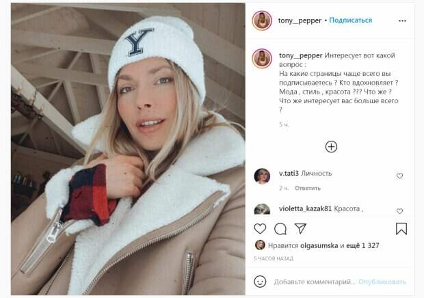 Легкий макияж завершил зимний образ. Антонина улыбалась и выглядела очень свежо и привлекательно. "Интересует вот какой вопрос : На какие страницы чаще всего вы подписываетесь ? Кто вдохновляет ? Мода , стиль , красота ??? Что же ? Что же интересует вас больше всего ?", - поинтересовалась артистка. За пять часов пост собрал более 1000 лайков и много комментариев. "Интересные люди, как Вы, Тоня! Если честно, раньше Вас не знала, но Ваши юмор и самоирония меня покорили и подписалась на Вас!", "На страницы где тепло, уютно, светло, естественно и искренне...как у Вас, например❤️от многих людей отписалась
