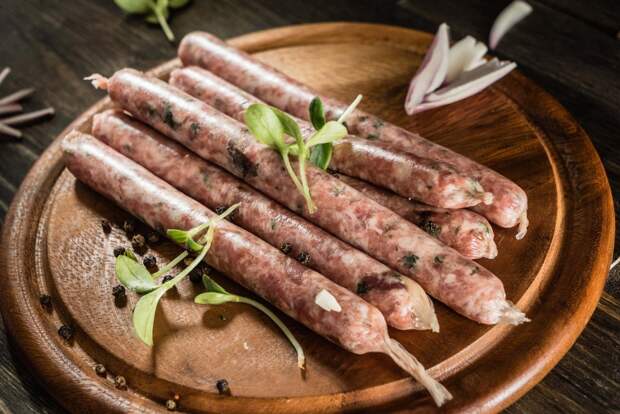 Ингредиенты: мясо чеснок соль, перец, приправы оболочка для колбасы натуральная Мясо для домашних колбасок можно нарезать на кусочки или перекрутить на мясорубке, по любому будет вкусно. В этом рецепте я перекрутил мясо. Добавляем соль, чеснок, перец и специи. Вы можете добавлять свои любимые приправы.