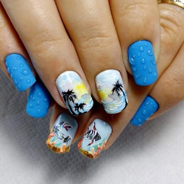 Морской маникюр, который вы можете видеть на представленных фото, модные тенденции 2021 года рекомендуют выбирать в первую очередь, если вы собираетесь на отдых. В офисе, в сочетании с деловым костюмом он точно будет смотреться нелепо, поэтому отдых на морском побережье – это самая идеальная ситуация для такого яркого дизайна.