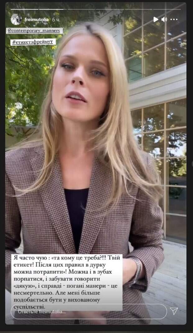 В этот раз Оля решила ответить на претензии к правилам, записав видео в сторис. "Я часто слышу: "та кому это нужно?!!! Твой этикет. После этих правил в дурку можно попасть"! Можно и в зубах ковыряться и забывать говорить "спасибо", и - на самом деле - плохие манеры - это не страшно. Но мне больше нравится быть в воспитанном обществе", - написан был комментарий под роликом. "Чтобы вы чувствовали себя уверенно, умели пользоваться миром, и получали от него все что необходимо", - сказала Оля в ответ, потеряв звук в первой части ролика. "Этикет с Фреймут", - добавила тэг красотка в сторис. Напомним, Фреймут публично "набросилась" на президента и взялась учить его этикету А еще Politeka писала, что Фреймут в полушпагате записала свежую порцию нравоучений, что запрещено панночке Также Politeka сообщала, что дочь Оли Фреймут сбежала в США и показала, как осваивается среди местных