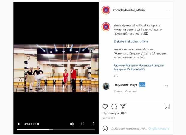 По сценарию артистка приехала выручать "балерин". Кухар раскритиковала звезд "Квартала", которые исполняли роли балерин, но не соответствовали стандартам. "А вас, простите, не смущает, что ваши балерины, мягко говоря, не в форме? Точнее, в очень мягкой форме?", - задала Екатерина вопрос, обращаясь к Елене Кравец, а в зале прозвучал смех. "Слышь, детеныш, не дерзи!", - произнесла одна из звезд "Квартала". "Екатерина Кухар на репетиции балетной труппы провинциального театра