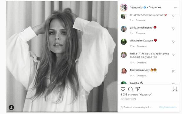 Об этом пишет Politeka.net со ссылкой на страничку знаменитости. Фанаты поставили более 6 тысяч лайков и написали комментарии: "Похожи на госпожу из Вия", "Истинную красоту передает именно черно белое фото. Вы прекрасны", "Как на меня, вы очень похожи на Лану Дель Рей", "Очень красивая". Сообщалось, что популярная украинская телеведущая Ольга Фреймут сверкнула красотой во время отдыха во Львове. «Номер, как всегда. Мой любимый 22…» — коротко говорится в сообщении. Уточним, что на снимках Фреймут позирует в элегантном платье, нагнувшись на камеру. Из-за этого в кадр попало лишнее. Сообщалось, что 38-летняя украинская телеведущая, писательница и модель Ольга Фреймут впечатлила невероятно нежным кадром. Ольга предстала в светлом платье с пышными рукавами, оголившим ее плечики и частично зону декольте. Утонченная блондинка с милым букетиком цветов расположилась в томной позе на крыльце особняка. Напомним, заменившая Фреймут звезда «Ревизора» потеряла мужа перед первой годовщиной свадьбы А еще Politeka писала, что дочь Фреймут в бикини переплюнула красотой наследниц Брежневой и Поляковой Также Politeka сообщала, что скандальная Фреймут в задранном платье нарвалась на критику