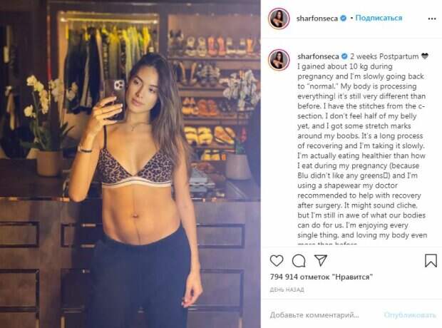 25-летняя модель призналась, во время беременности умудрилась набрать лишними 10 килограммов. "Я постепенно возвращаюсь в форму, но все равно пока не выгляжу так, как раньше. Мое тело изменилось: мне наложили швы после кесарева сечения, я не чувствую половины своего живота, у меня появилось несколько растяжек на груди. Процесс восстановления длинный, но сейчас я люблю свое тело даже больше, чем раньше", – написала Фонсека в личном микроблоге. Фанаты пришли в восторг от отличной формы модели, которая только две недели назад родила девочку. "Выглядишь потрясающе. Женское тело невероятное", "Ты красивая", "Вы по-прежнему выглядите потрясающе !!! Спасибо, что поделились этим с нами", "Вы красивы