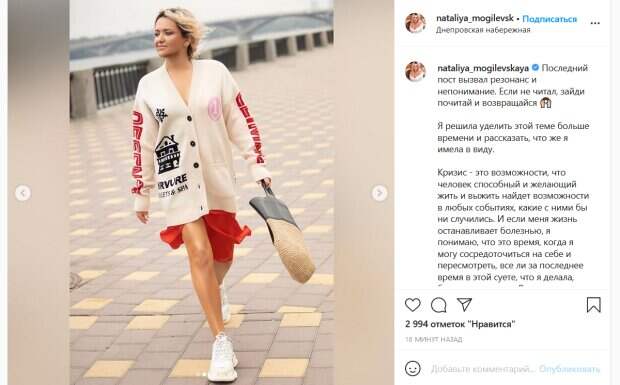 «Я хотела акцентировать внимание на этом, и как же глупо, находясь в таких условиях, продолжать направлять внимание во внешний мир, пересматривая бездумно сериалы, телевизионные передачи, читая пусть даже самые прекрасные глубокие книги о чужой судьбе, когда сама Планета тебе говорит - обрати внимание на себя!», - написала певица. Она также поделилась своими фото, на которых прогуливается по набережной Днепра в весеннем образе. На ней был длинный кардиган цвета слоновой кости и красная юбка из легкой ткани, которая из-за ветра слегка задралась вверх, обнажая ноги звезды. «Вторая фото для тех, кто любит ножки и для умниц, что дочитывает текст до конца», - добавила в своем посте Могилевская. Ее поклонники тут же принялись комментировать пост. «Очаровательные ножки», «Наталья восхищаюсь вами, для меня вы и красавица и умница. Всех благ вам!», «Шикарно выглядите», «Наташа, так хорошо выглядите», «Красотка, а ножки и правда мы любим, они шикарные у вас», - пишут люди. Напомним, 45-летняя Могилевская в платье с эффектным вырезом показала, как нужно кайфовать от жизни. Как сообщала Politeka, Могилевская упрекнула украинцев-бездельников, рассказав, как впахивает и все успевает: «Мне не интересны…». Также Politeka писала, что Могилевская вызвала бурю эмоций, трогательно обратившись к украинцам: "Держитесь, Натали...".
