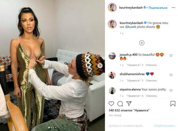 Так, на первом снимке стилист поправляет глубокое декольте наряда, которое почти полностью раскрывает грудь Кардашьян. Сама Кортни при этом стоит и смиренно ждет, когда закончится работа с костюмом. Можно заметить, что ее образ также дополняет роскошный макияж глаз с золотистой аппликацией. Кортни также показала процесс самой фотосессии и поделилась снимком, на котором стоит в пол-оборота, демонстрируя плавный изгиб спины и впечатляющую пятую точку в обтягивающем платье. Поклонники звезды пришли в восторг от ее гламурного образа и буквально засыпали Кортни комплиментами. Всего за час ее пост набрал более 300 тысяч лайков. Ранее мы писали, что Кардашьян показала себя на отдыхе. На фото Кортни позирует в купальнике телесного цвета, сидя у края бассейна. Звезда дополнила образ стильными очками, а волосы собрала назад. Красотка похвасталась загорелым телом, которое выглядит безупречно. Напомним, фигуристая Кортни Кардашьян в "невидимом" бикини устроила сеанс соблазнения у бассейна. Как сообщала Politeka, Кортни Кардашьян приспустила шелковый халатик и заставила мужчин глотать слюнки. Также Politeka писала, что 40-летняя Ким Кардашьян в купальнике дала фору младшей сестре, кадры соблазна.