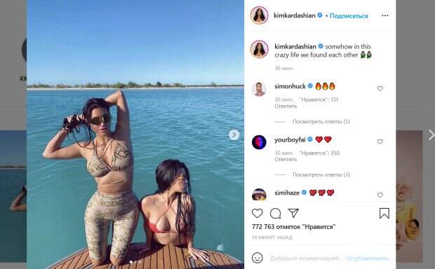 Красотки решили передохнуть от плавания, выбравшись из воды и продемонстрировав свои впечатляющие фигуры. Ким выбрала для отдыха необычный купальный костюм бежевого цвета с длинными плавками и лифом с кокетливыми завязками. А вот красный ее сестры оказался гораздо более минималистичным: крошечный бикини едва прикрывал самые откровенные места на теле Кортни. Кожа и волосы обеих красоток на снимках выглядят все еще влажными после плавания. При этом, поклонников звездного семейства насмешила подпись, которую Ким оставила под снимками. «Каким-то образом в этой сумасшедшей жизни мы нашли друг друга», - написала Кардашьян. «Вы в прямом смысле слова сестры», «Это потому что вы сестры», «Вы сестры, не думаю, что это было так уж сложно, Ким», «Королевы», - с иронией пишут комментаторы. Ранее мы писали, что Ким появилось фото, на котором она позирует на пляже в оливковом купальнике. Она не стала придумывать каких-то сложных подписей для пляжных снимков, сопроводив кадры подборкой смайликов. Напомним, Ким Кардашьян устроила сеанс соблазнения, сжав фамильную гордость узким топом: "сейчас выпрыгнут". А еще Politeka писала, что идеальная Ким Кардашьян поиграла язычком, блеснув завидными размерами в бикини: "Распек до предела". Также Politeka сообщала, что Ким Кардашьян показала невероятные изгибы в черном латексе: "кажется, скоро треснет".