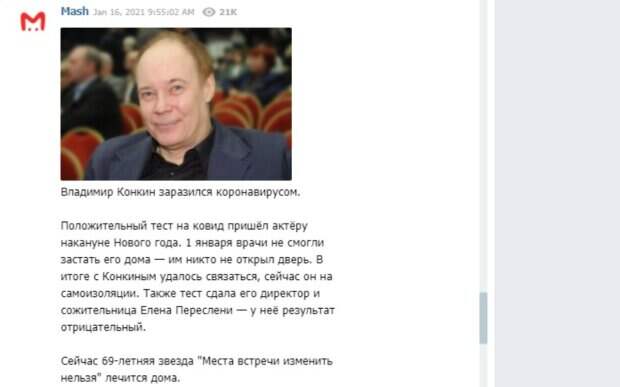 У актера Владимира Конкина подтвердили "китайский" вирус Как передает Politeka.net, об этом сообщил Telegram-канал "Mash". Положительный тест на вирус пришёл актёру еще накануне Нового года. "1 января врачи не смогли застать его дома — им никто не открыл дверь. В итоге с Конкиным удалось связаться, сейчас он на самоизоляции.