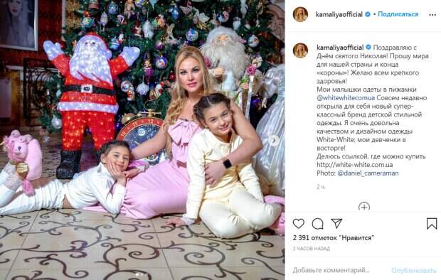 "Поздравляю с Днем святого Николая! Прошу мира для нашей страны и конца "короны"! Желаю всем крепкого здоровья", - написала она. Также певица опубликовала еще одно фото, на котором позируют только ее дочери. Девочки сели на пол возле новогодней елки и позируют "в компании" Дедов Морозов. Они одеты очень по-домашнему - в пижамы и тапочки с единорогами. В комментариях певицу также поздравили с праздником и выразили восхищение красивой семьей Камалии. "Вы такая красивая, все такая же, глаз не отвести", "Принцессы", "Мои любимые красавицы, с праздником вас", "Спасибо, взаимно, хорошая мама, хорошие доченьки", "Какие вы все счастливые и красивые", "Доченьки красавицы", "Какие красивые девочки", "Спасибо вам за теплые пожелания", - пишут в комментариях. Напомним, богатейшая певица Украины после болезни рассказала о новой беде в семье Также Politeka писала, что самая богатая певица Украины после болезни дала жару в бесстыдном декольте А еще Politeka сообщала, что самая богатая певица Украины после болезни поразила новым видео, забравшись на стол