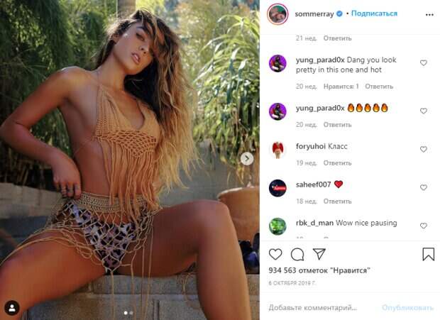 Как известно, чаще всего в профиле знаменитости в социальной сети Инстаграм можно найти кадры из спортзала, жаркие фото с тренировок в модных трендовых костюмах и рекомендации по правильным упражнениям длятого, чтобы накачать рельефные формы без проблем. Изредка девушка делится фото с пляжа или фотосессий, устроенных в модных студиях. К примеру, в этот раз Соммер покорила провокационной позой в однм белье и тонкой сеточке, совсем не скрывающей ее грудь. «Чье имя вы ищете в просмотрах истории Insta?», - написала под фото Соммер. Вот что ответили фанаты: «Очень горяча», «Черт возьми, ты выглядишь красиво и горячо», «Класс», «Вау, хорошая поза», «Горячий вид и она тоже», «Мне 29 лет, но я не люблю тебя, мне нравится твой контент, и я поддерживаю тебя», «Как голодная кошечка», «Очень жарко🔥🔥🔥», «Боже, это красивое тело, хотя оно идеально», «Вот это да», «У меня есть тренировка для тебя! Ударь меня в dms!», «Вот это да!!! Ты такой идеальный малыш 🥰🤞💯». До этого удивительно стройная модель восхитила видом в супер-коротеньком топе на тонких лямках и серых шортах. Соммер решила показать, как занимается в зале и представила личный топ своих популярных упражений. Для идеальной талии Рэй покрутила обруч, для подтянутых бедер и упругих ягодиц девушка порекомендовала приседания с уклоном, а для рельефной формы ног специальные упраженения с резинками. «В настоящее время группы занятий живут в @shopsommerray 😛 добавь эти группы к своей тренировке, и я обещаю, они изменят твою жизнь», - написала Соммер. Вот что ответили фанаты: «Дай мне попробовать», «У меня будет песня с Muscle Man!», «Только здесь для начала нужно иначе заниматься», «хорошо но нравится как ты такая красивая ?!», «Хороший газон. Все это», «Так много ботов», «мои гости приглашают ко мне ваши формы😋», «КАК??? Как кто-нибудь может быть таким идеальным?», «Вы так великолепны 💛», «Я люблю» тебя, идеальная детка 💛», «Вы пришли сегодня взбодрились», «Beautiful🔥». Напомним, шикарная Ана Чери показала нереальные объемы, лосины аж трещат А еще Politeka писала, фитнес-модель Соммер Рэй впечатлила невероятной фигурой: "Утерла нос Ане Чери и Деми Роуз" Также Politeka сообщала, что Ана Чери в наряде с вырезом изогнулась ради горячих снимков