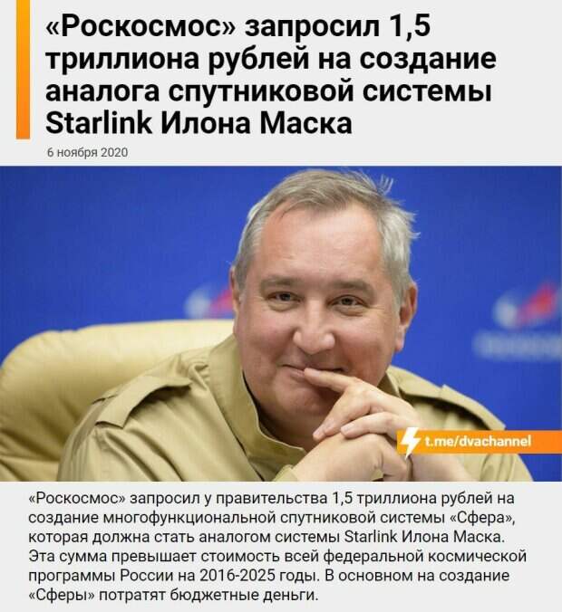 Как отмечает российская пресса, запрашиваемая «Роскосмосом» сумма превышает размер стоимости всей Федеральной космической программы РФ на десятилетний период с 2016 по 2025 год. Для сравнения, бюджет Пермской области составляет 153 млрд рублей. В сети уже высмеяли попытки Рогозина хоть как-то обойти Маска. «Илону Маску только не рассказывайте. "Роскосмос" запросил у правительства 1,5 трлн рублей на создание российского ответа Starlink», – написал блогер Մιtαuskαs. «Будут сбивать спутники Маска?», «Миллиард роутеров! Можно плотненько всю территорию застлать», «Неужели Рогозин что-то знает о текущем здоровье Путина? Как в восточных сказках: или эмир, или осел», «Мне кажется, ещё пару лет назад обещали «Сферу», но Роскосмос так и не запустил НИ ОДНОГО спутника. Тем временем SpaceX запустила всего 893 спутника Starlink. Опять «происки Запада»?», – иронизируют пользователи. Ранее Рогозин заявил, что в России хватает своих «илонов масков», а также заговорил о намерении сделать аналог корабля Dragon Crew. Правда, все планы главного космонавта России, как правило, становятся объектом насмешек. Напомним, главный космонавт России оконфузился заявлением о приватизации Луны. Как сообщала Politeka, путинская армия осталась без мощнейшего оружия. Также Politeka писала, что главный космонавт Путина внезапно заговорил на украинском языке.
