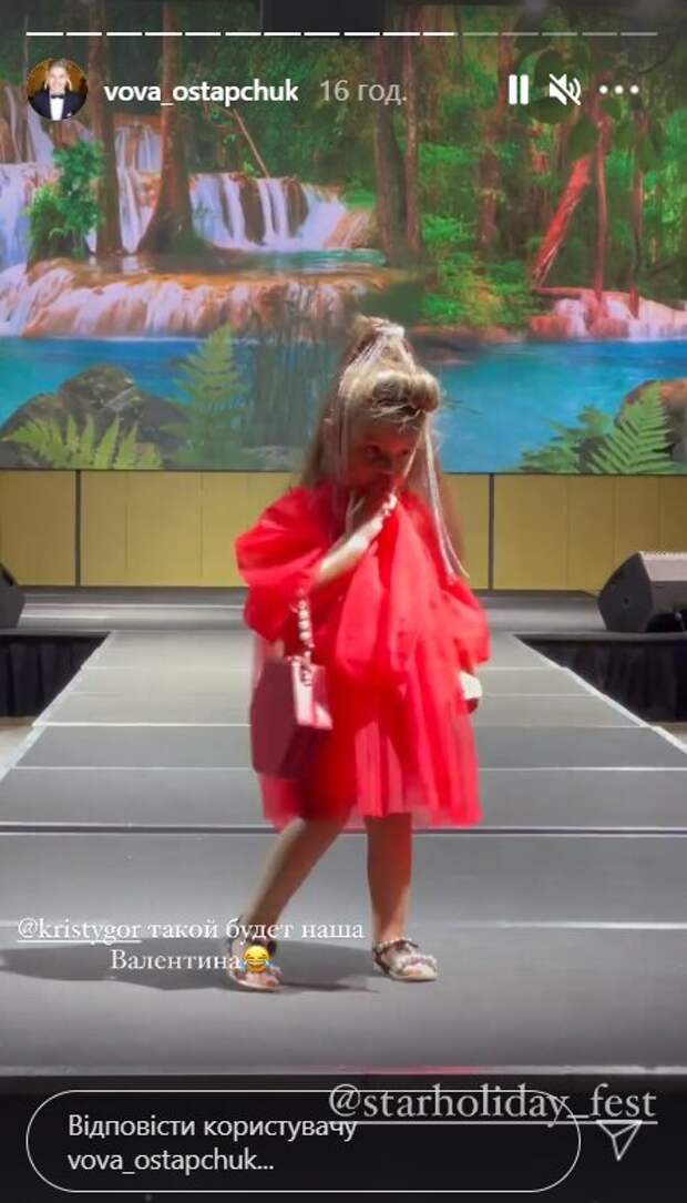 Однако, это не помешало паре быть вместе. Как пишет Politeka.net, в разделе сториз на своей странице в Инстаграм Остапчук показал дерзкую девочку на подиуме конкурса Star Holiday Fest и предположил, если у них будет дочь, то только такая, как эта девочка и назовут ее Валентиной, за кадром шоумен забавно комментирует происходящее на сцене: "Моя ты мася". "Кристина Горняк, такой будет наша Валентина", - написал Остапчук, отметив свою супругу. Следующую сториз он сопроводил видео коротким надписом: "Примадонна", на котором Остапчук еще раз показал, как умело позирует на подиуме девочка лет пяти в красном наряде. Популярная радиостанция NRJ при поддержке известных продюсеров и артистов проводит уникальный вокальный проект "Star Holiday Fest", среди певцов 6-18 лет. Жюри фестиваля состоит из известных деятелей культуры и искусства, продюсеров, представителей шоу-бизнеса, признанных авторитетов вокального, музыкального и хореографического искусства. Похоже, в этот раз Остапчук находился среди жюри. Напомним, жена Остапчука с заклеенным ртом удивила занятием, пока муж в отъезде: "Кайфанула, однозначно". Как сообщала Politeka, жена Остапчука в белоснежном платье с декольте показала гулянку с подругами: "Вечер перестает быть томным". Также Politeka писала, что жена Остапчука неожиданно вызверилась на украинцев за намек о "притворщике" муже: "Не бесите меня!".
