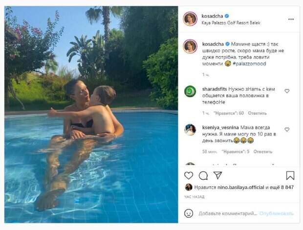 Так, Катя решила показать, как отдыхает в Турции. На фото можно увидеть Осадчую и сына Ивана. Парочка сидела в бассейне, где мама обнимала малыша. "Мамино счастье :) так быстро растет, скоро мама будет не очень нужна, надо ловить моменты", - написала Осадчая. "А папа уже на работе", - написал Горбунов. Фанаты поставили более 8 тысяч лайков и написали комментарии: "Мама всегда нужна. Я маме могу по 10 раз в день звонить", "Дети - это прекрасно", "У вас будет хорошая разница между детками, ещё будете благодарны его самостоятельности, а пока да нужно кайфовать они так быстро растут, хотя кому я рассказываю ваш старый сын тому пример, уже мужчина". Напомним, Кухар, Осадчая, Полякова и другие звезды признались, куда "сбежали" из Украины А еще Politeka писала, что беременную Осадчую раскритиковали из-за неудачного выбора купальников, показательные фото Также Politeka сообщала, что беременная Осадчая в Турции призналась, как ей жилось последние два месяца
