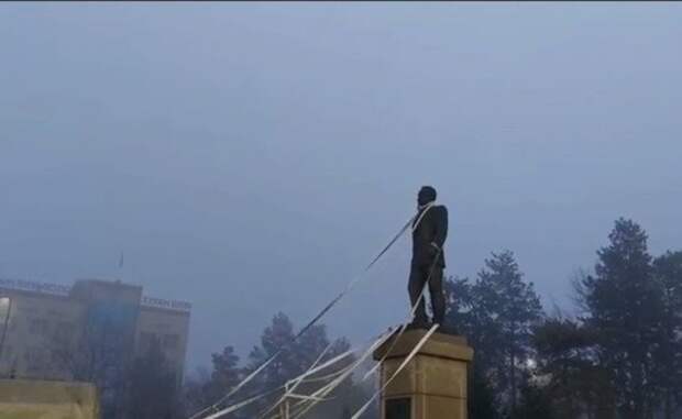В Казахстане продолжаются массовые протесты. В городе Талдыкорган митингующие решили снести памятник экс-президенту страны Нурсултану Назарбаеву. Кадры попыток казахстанцев снести монумент появились в соцсети. К памятнику привязали веревки. С помощью них протестующие и планируют уронить монумент. Протесты в Казахстане не утихают вот уже несколько дней.