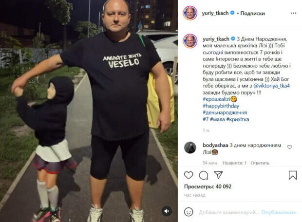 15 сентября Лизе исполняется 7 лет. По этому поводу Ткач поделился искренним поздравлением, в котором постарался выразить свою любовь к дочке. «С Днем Рождения, моя маленькая крошка Лизи))) Тебе сегодня исполняется 7 годиков и самое интересное в жизни у тебя еще впереди))) Бесконечно тебя люблю и буду делать все, чтобы ты всегда была счастлива и улыбалась))) Пусть Бог тебя хранит, а мы с Викой всегда будем рядом!», - написал комик. Он также поделился коротким видео, на котором держит дочь за руку, пока та крутится, поворачиваясь на 360 градусов. Поклонники Ткача присоединились к его поздравлениям. «Искренне поздравляю вашу дочь с днем рождения. Желаю ей крепкого-крепкого здоровья, счастья и исполнения всех желаний», «Всего всего самого наилучшего тебе всегда», «С именинницей вас», «Поздравляю маленькое солнышко, веселушку Лизу с праздником», - пишут люди. Напомним, дочь Юрия Ткача разревелась под школой с одноклассницей Кошевой. Как сообщала Politeka, звезда "Квартал 95" Ткач показал, что может заставить его визжать. Также Politeka писала, что жена Ткача тяжело переживает расставание с дочерью.