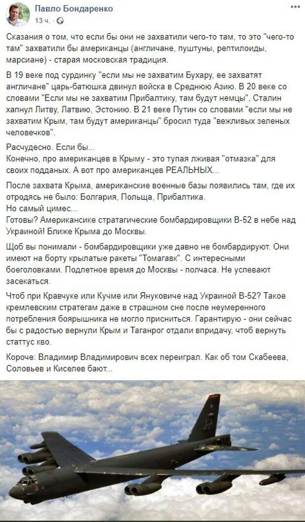 net со ссылкой на сообщение командования Воздушных сил. «Экипажи B-52 обеспечивают возможности коллективной обороны для США, союзников по НАТО и партнеров, а также стратегические и оперативные возможности для сдерживания России», – говорится на странице командования в Фейсбуке. По этому поводу свое мнение высказал и известный украинский историк и блогер Павел Бондаренко. По его словам, русские пугалки о том, что если бы они не захватили «чего-то там», то это сделали бы американцы (англичане, пуштуны, рептилоиды, марсиане) обрели новый смысл. «В 19 веке под сурдинку «если мы не захватим Бухару, ее захватят англичане» царь-батюшка двинул войска в Среднюю Азию. В 20 веке со словами «Если мы не захватим Прибалтику, там будут немцы», Сталин хапнул Литву, Латвию, Эстонию. В 21 веке Путин со словами «если мы не захватим Крым, там будут американцы» бросил туда «вежливых зеленых человечков»», – пишет блогер. Бондаренко отметил, что после того, как Россия захватила Крым, американцы действительно появились там, где их никогда не было. И это – не оккупированный полуостров, в такие страны как Болгария, Польша, Прибалтика. «Но самый цимес... Американсике стратегические бомбардировщики В-52 в небе над Украиной! Ближе Крыма до Москвы», – подчеркнул историк. Он обратил внимание на то, что бомбардировщики имеют на борту крылатые ракеты «Томагавк», которые могут за полчаса долететь до Москвы. И это не может не тревожить российскую верхушку. «Чтоб при Кравчуке или Кучме, или Януковиче над Украиной В-52? Такое кремлевским стратегам даже в страшном сне после неумеренного потребления боярышника не могло присниться. Гарантирую - они сейчас бы с радостью вернули Крым и Таганрог отдали впридачу, чтоб вернуть статус кво», – иронизирует Бондаренко, заметив по ходу, как Путин снова всех «переиграл». Напомним, одесситов всполошила военная авиация НАТО над городом. Как сообщала Politeka, новая разработка россиян в военной авиации обернулась позором. Также Politeka писала, что Россия задействовала авиацию в Крыму после сообщений о вторжении в Украину.