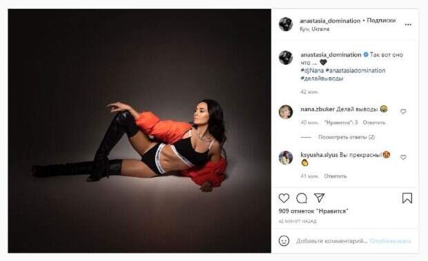 Видно, что красотка следит за своей фигурой, поэтому кадры всегда вызывают восторг. Так случилось и этот раз, Анастасия показалась в черных трусиках и топе. Девушка сверху надела куртку, а вместо штанов использовала ботфорты. Красотка лежа задрала одну ножку, восхищая изгибами. "Так вот оно что ....", - написала загадочно Анастасия под снимком. Фанаты поставили почти тысячу лайков и написали комментарии: "Делай выводы", "Вы прекрасны", "Шикарно, модель, свет", "Рад видеть тебя снова!", "Ох и бомба", "Обожаю", "Хорошая фотография этой Анастасии. Хорошая тема". Мы писали, что певица и диджей Анастасия Кумейко похвасталась фигурой в розовом белье. Красотка была в обтягивающем топе-лифчике на тонких белых бретельках. Звезда надела трусики такого же цвета, резинка которых впивалась в кожу. На первом снимке певица позировала на столе, подогнув ножки. Напомним, экс-Nikita Кумейко позволила налюбоваться каждым сантиметром роскошного декольте А еще Politeka писала, что фигуристая экс-Nikita Кумейко в сверкающем мини отожгла на закрытой вечеринке Также Politeka сообщала, что бесстыжая экс-Nikita Кумейко в прозрачном наряде взбудоражила постельными сценами