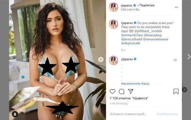 Маленькие треугольные лоскутки ткани едва ли прикрыли пышную грудь. Последняя впечатляла размерами и завораживала. Модель также надела малюсенькие плавочки на тончайших бретельках, подпрыгнувших выше бедер. Завершили образ различные украшения. Звезда распустила длинные волнистые волосы, которые создавали на голове прямо большую гриву. Макияж подчеркнул пухлость губ, а также сделал акцент на большие глаза с пышными ресницами. "Вас пугают змеи? В наши дни они мерещатся повсюду!", - подписала снимок звезда. За восемь часов пост собрал около 8000 лайков и много комментариев. Пользователи сети написали звезде очень много хорошего. Ранее мы писали, что 35-летняя Кассандра Сьенега уже давно рекламирует бикини. Звезда призналась, что ее идеальный мужчина обладает чувством юмора, а также ухоженный. "Обожаю, когда мужчина носит костюм и хорошо пахнет... мне хочется прыгнуть на него и сорвать с него одежду, как тигр когтями", - рассказала модель. Кроме того, брюнетка любит парней, которые могут ее чему-то научить: от нового языка и блюда до позы в постели. Знаменитость описывает себя, как очень открытую девушку. Напомним, Кассандра Сьенега из Playboy намочила свои "булочки" и выставила их во всей красе: "Ты все божественнее" Как сообщала Politeka, Кассандра Сьенега из Playboy раскинулась на солнышке, едва не выронив бюст: "Танцовщица из. .." Также Politeka писала, что Кассандра Сьенега из Playboy посветила необъятным «орешком», обтянув его тесным платьем: «Мой идеал!»