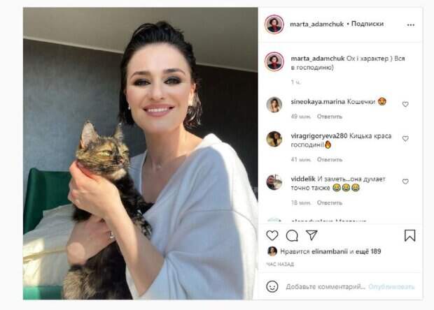 В этот раз Марта опубликовала фото, где позировала в спальне. Девушка в руках держала домашнего любимца - кошечку. Красотка улыбалась, хотя животное не таким довольным было. "Ох и характер. Вся в хозяйку", - написала Марта Адамчук под фотографией. Фанаты поставили почти 200 лайков и написали комментарии: "Кошечки", "Кошечка - красота хозяйки", "И заметь, она думает точно также", "Марточка, у вас красивая кошечка. Какая порода?". Ранее мы писали, что популярная актриса и певица Марта Адамчук покрасовалась новым образом в анонсе теле-шоу. В своем профиле в социальной сети Инстаграм Марта разместила подборку кадров, сделанных во время записи нового эфира программы "Женский квартал". На фото Марта позировала в черном изысканном платье. Она вела программу, ее со-ведущим был Евгений Кошевой в строгом костюме. Напомним, роскошная брюнетка из "Женского Квартала" Адамчук свела с ума формами в бездонном декольте А еще Politeka писала, что стройная брюнетка из "Женского Квартала" Адамчук превратилась в красотку-невесту Также Politeka сообщала, что знойная брюнетка из "Женского Квартала" Адамчук заворожила фигурой в обтягивающем платье