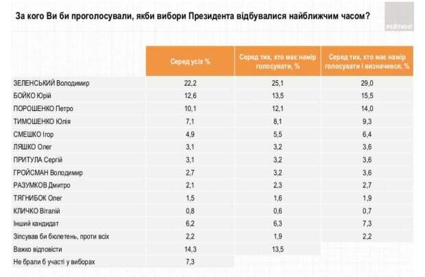 За пятого президента Украины Петра Порошенко готовы отдать голоса 14% опрошенных. Лидера ВО "Батькивщина" Юлию Тимошенко поддерживают 9,3% респондентов, за Игоря Смешко – 6,4%. Следом идут Олег Ляшко, бывший премьер-министр Владимир Гройсман и Сергей Притула с голоса – по 3,6%. 2,7% поддерживают спикера Верховной Рады Дмитрия Разумкова, 1,9% - Олега Тягнибока и 0,7 действующего мэра Киева Виталия Кличко. 7,3% респондентов не определились с выбором. 2,2% испортили бы бюллетень. Исследование проведено группой "Рейтинг" 3-6 сентября 2020 года.