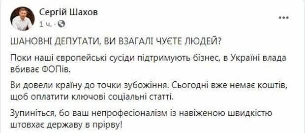 Власть довела страну до обнищания и никак не поддерживает украинцев во время кризиса Об этом в своем Facebook сообщил нардеп Сергей Шахов. По его словам, непрофессионализм власти с большой скоростью толкает государство в пропасть. "Уважаемые депутаты, вы вообще слышите людей? Пока наши европейские соседи поддерживают бизнес, в Украине власть убивает Фопов.