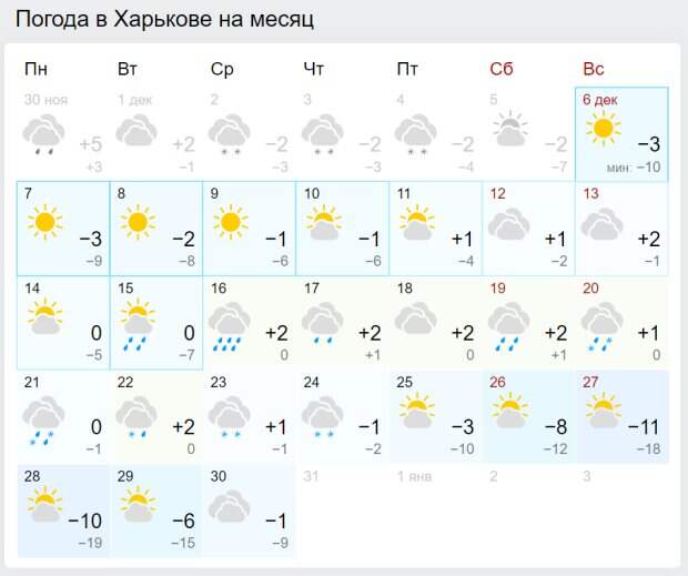 В Украину уже в декабре придут сильные морозы вплоть до -26 градусов О том, как будет меняться температура в ближайшие недели, рассказали синоптики Gismeteo в своем подробном прогнозе на декабрь. По их информации, в этом месяце будет несколько периодов похолодания. Первый начался сегодня, 6 декабря, и продлится ориентировочно до 9 числа.