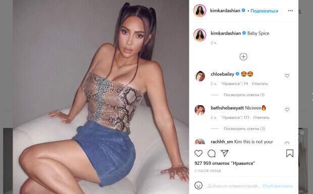 Так, на фото модель позирует в топе без бретелек, стилизованным под змеиную кожу. Тесный наряд стянул талию красотки, а также приподнял ее грудь, сделав фигуру Кардашьян еще более соблазнительной. Под такой неординарный топ Ким подобрала и соответствующую мини-юбку голубого цвета и со «змеиной» фактурой. На фото красотка сидит в огромном кресле, слегка приподнимаясь на руках. Дополняет ее образ кокетливая прическа из двух невысоких хвостиков. Поклонники звезды пришли в восторг от ее образа. «Второй такой нет», «Ким, это не твое лицо», «Слишком красивая, чтобы быть правдой», «Если это недавнее фото, ты выглядишь замечательно», - пишут люди. Ранее мы писали, что Ким Кардашьян впечатлила видом в серебристом комбинезоне. Костюм подчеркнул выдающиеся формы пышной звезды. Волосы Кардашьян собрала в хвост, который придал образу особого шарма. Напомним, Ким Кардашьян аппетитно повиляла бедрами, сбросив все лишнее на пляже: "Безупречная!". Как сообщала Politeka, Ким Кардашьян в жарком мини слетела с катушек, устроив безумные игры с тортом: «Сладкая девочка». Также Politeka писала, что знойная Ким Кардашьян едва уместила притягательные формы в тесный кожаный наряд, покорив изгибами: "Скучаю по. ..".