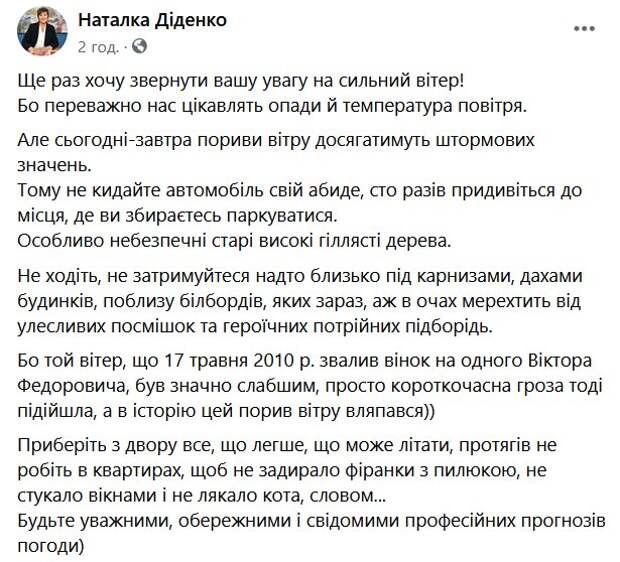 В ночь на 19 сентября такие температуры будут возможны уже в большинстве областей страны за исключением Юга. 18 сентября в Украину придет сильный северо-западный и северный ветер, до штормовых порывов. «Еще раз хочу обратить ваше внимание на сильный ветер! Сегодня-завтра порывы ветра будут достигать штормовых значений. Поэтому не бросайте автомобиль свой где-попало сто раз присмотритесь к месту, где вы собираетесь парковаться. Особенно опасны старые высокие ветвистые деревья», - предупредила синоптик. Диденко также сообщила, что 18 сентября из Украины уйдет фронт, который ранее принес в некоторые области дожди. После этого в стране снова воцарится сухая погода. Локальные дожди возможны только в Сумской и Харьковской областях. Ожидается, что в пятницу температура воздуха резко устремится вниз. Так, в среднем термометры покажут от +12 до +17 градусов, а на Юге – от +15 до +20. В Киеве погода будет сухой, но с сильным северо-западным ветром. Похолодание также не обойдет столицу стороной. Столбики термометров опустятся до +14 градусов. «Кто реагирует чувствительно на изменение погоды – залегайте на один день на уютное "дно")) В течение субботы-воскресенья жара не восстановится, но все же немного потеплеет», - подытожила синоптик. Напомним, заморозки внезапно ударят по Киеву, появился прогноз: "Будет резкое похолодание и...". Как сообщала Politeka, погода приготовила новое испытание для украинцев, точный прогноз. Также Politeka писала, что заморозки ударят по Украине, атмосферный фронт никого не пожалеет.