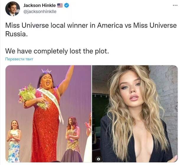 Победой трансгендера – биологического мужчины Брайана Нгуена – на конкурсе красоты «Мисс Америка» возмутился комик и журналист Джексон Хинкл. В социальных сетях корреспондент выложил два снимка «для сравнения». Речь идет о снимках Нгуена в обтягивающем красном платье и победительницы конкурса «Мисс Россия – 2022» Анны Линниковой.